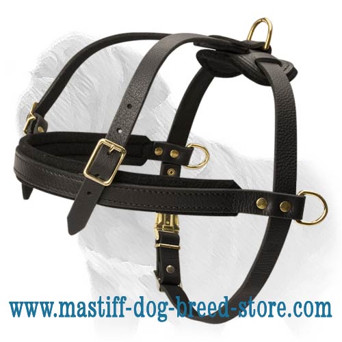 - Although this harness looks so delicate, it will deal easily with a beast! As it is manufactured of 100% full grain genuine leather, this harness will serve your Mastiff for long years.